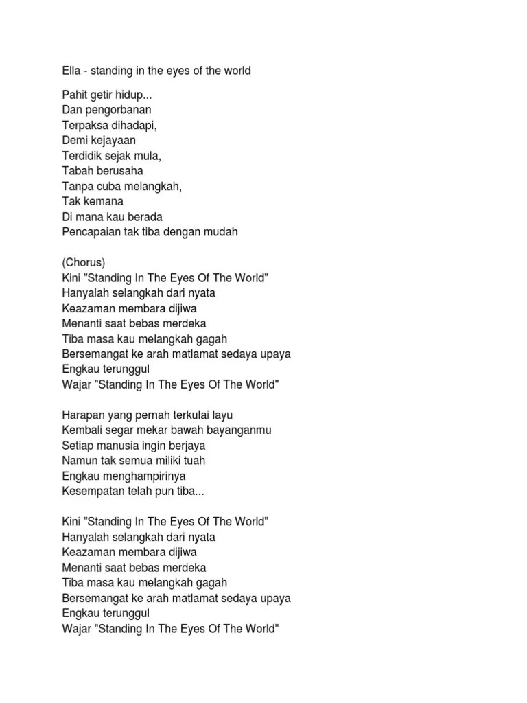 Pahit getir hidup dan pengorbanan Terpaksa dihadapi demi kejayaan Terdidik sejak mula tabah berusaha Tanpa cuba melangkah tak kemana Di mana kau berada Pencapaian tak tiba dengan mudah Kini Standing In The Eyes Of The World Hanyalah selangkah dari nyata Keazaman membara dijiwa Menanti saat bebas merdeka Tiba masa kau melangkah gagah Bersemangat. Tiba masa kau melangkah gagah. Ella Live - Standing In The Eyes Of The World by.